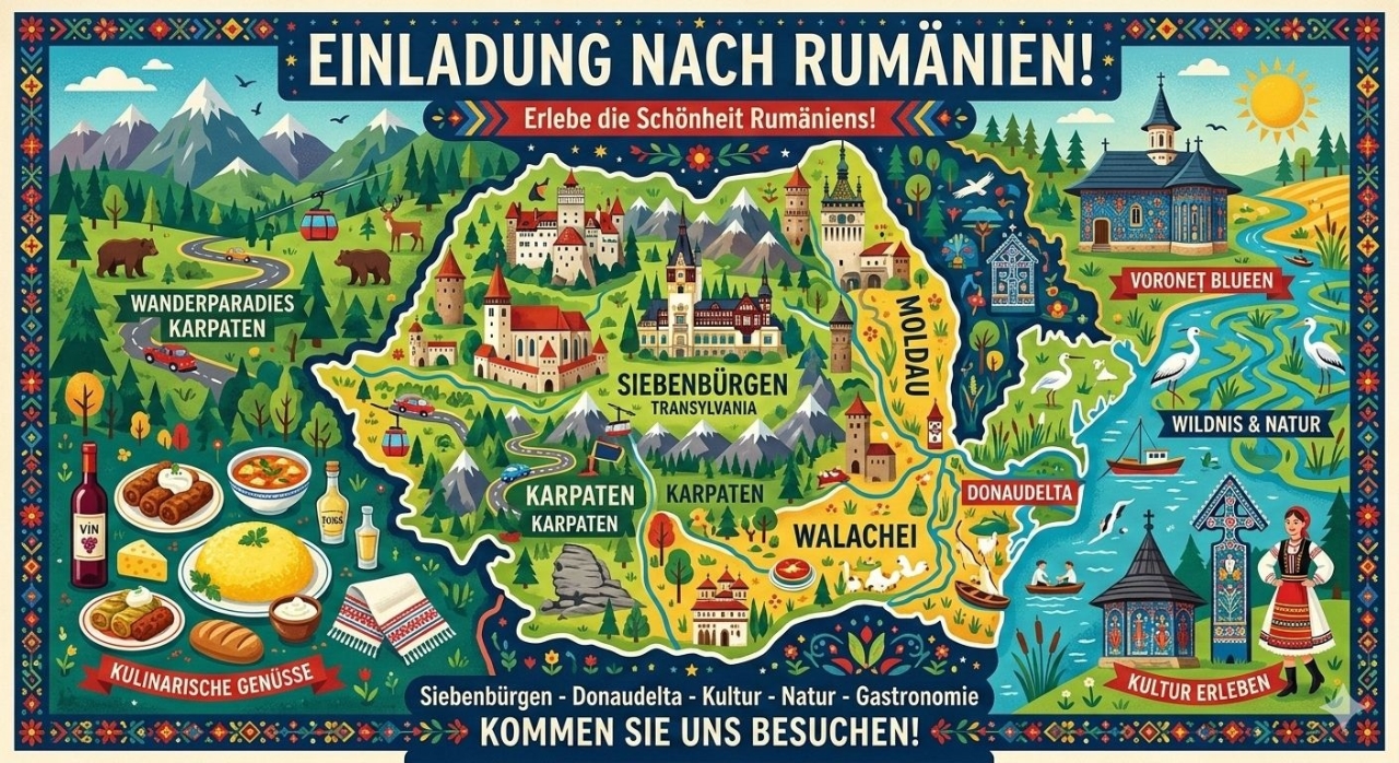 Von den Holzkirchen im Maramuresch, Kirchenburgen aus Siebenbürgen, Klöster aus dem Buchenland bis hin zu Wandertouren in den Karpaten, Fahrrardtouren in den Hügellandschaften, Bootsfahrten in der Donaudelta und Badeurlaub am Schwarzen Meer hat Rumänien alles anzubieten.